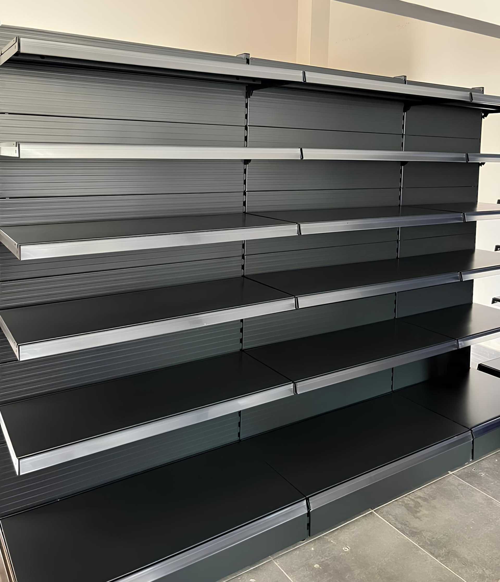 Η ραφιέρα μπορεί να εξοπλιστεί είτε με ίσιες μεταλλικές πλάτες, για ενιαία επιφάνεια προβολής, είτε με διάτρητες πλάτες που δέχονται άγκιστρα (hooks) όλων των διαστάσεων, ιδανικές για προϊόντα που χρειάζονται κρέμαση. Με τη δυνατότητα προσαρμογής του αριθμού και του τύπου των ραφιών, επιτυγχάνεται μέγιστη αξιοποίηση του διαθέσιμου χώρου και βέλτιστη ορατότητα των προϊόντων.