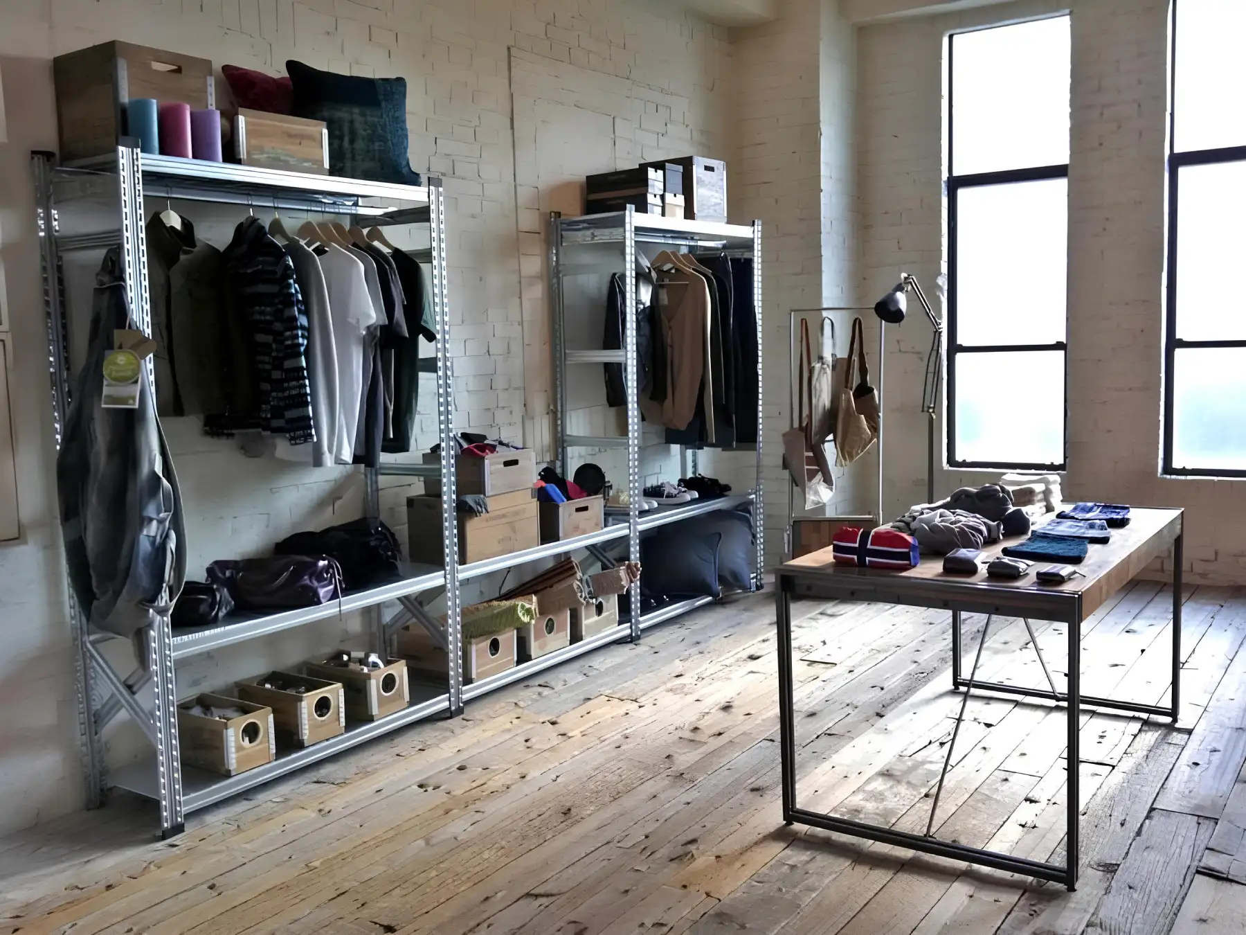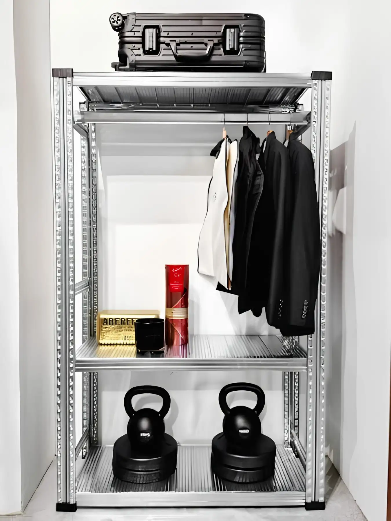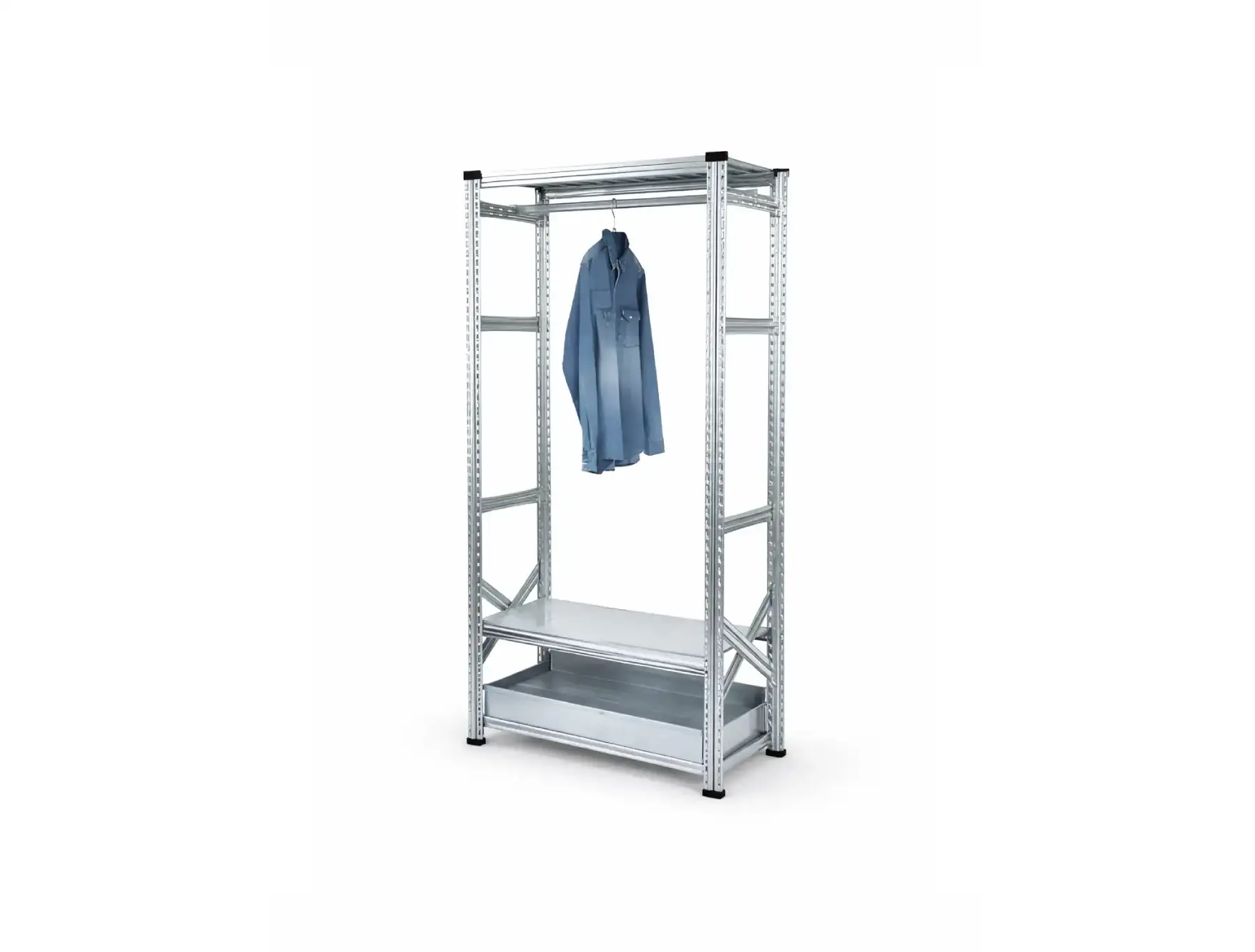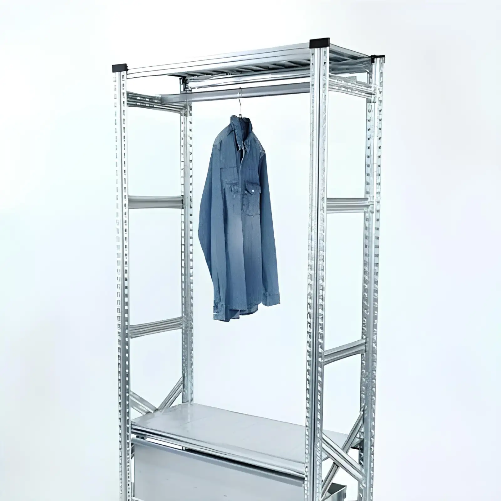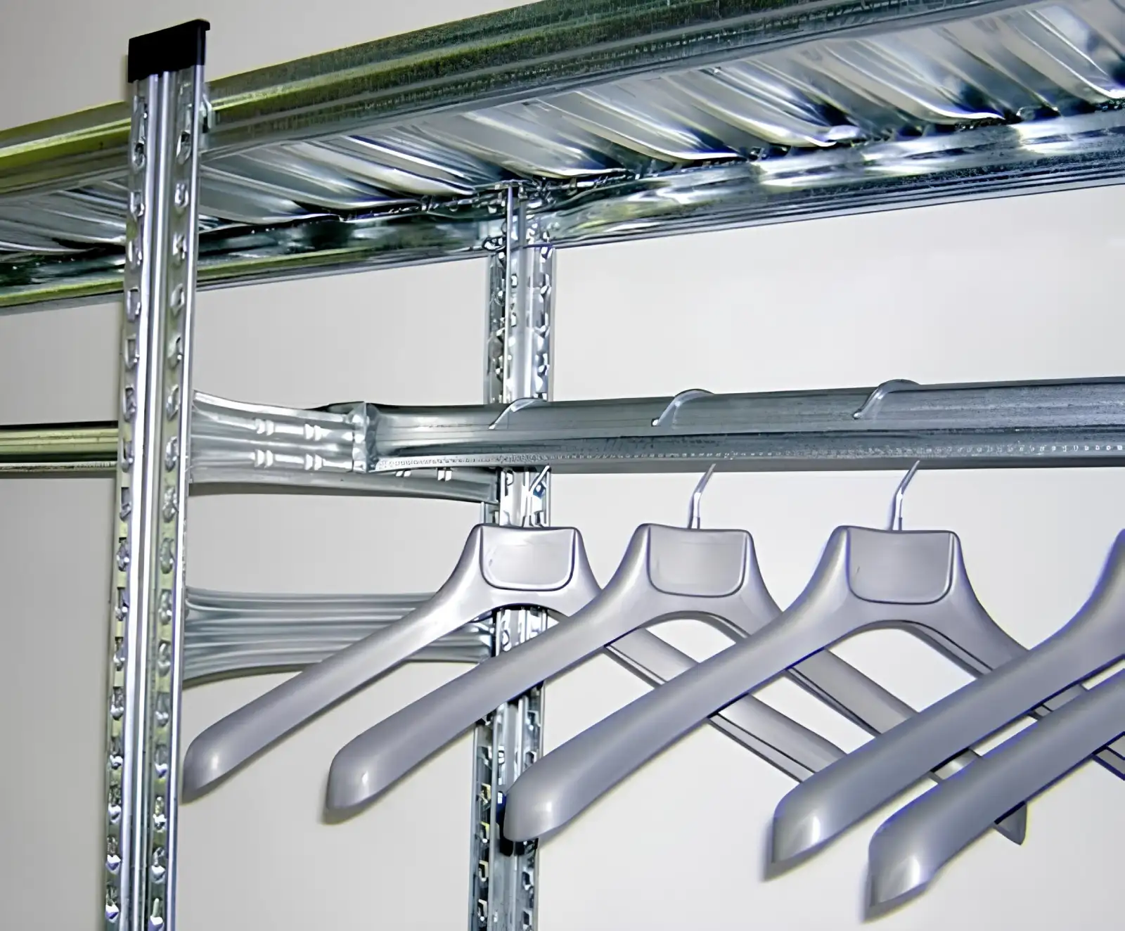 Η λύση αυτή είναι ιδιαίτερα ευέλικτη, καθώς επιτρέπει τον συνδυασμό διαφορετικών τρόπων αποθήκευσης στο ίδιο σύστημα ραφιών. Για παράδειγμα, μπορούν να τοποθετηθούν ράφια στο κάτω μέρος για κουτιά ή προϊόντα και σε ψηλότερο επίπεδο η κρεμάστρα για ρούχα, εξοπλισμό ή άλλα αντικείμενα. Με τον τρόπο αυτό αξιοποιείται καλύτερα ο διαθέσιμος χώρος, διατηρώντας ταυτόχρονα εύκολη πρόσβαση και σωστή οργάνωση.