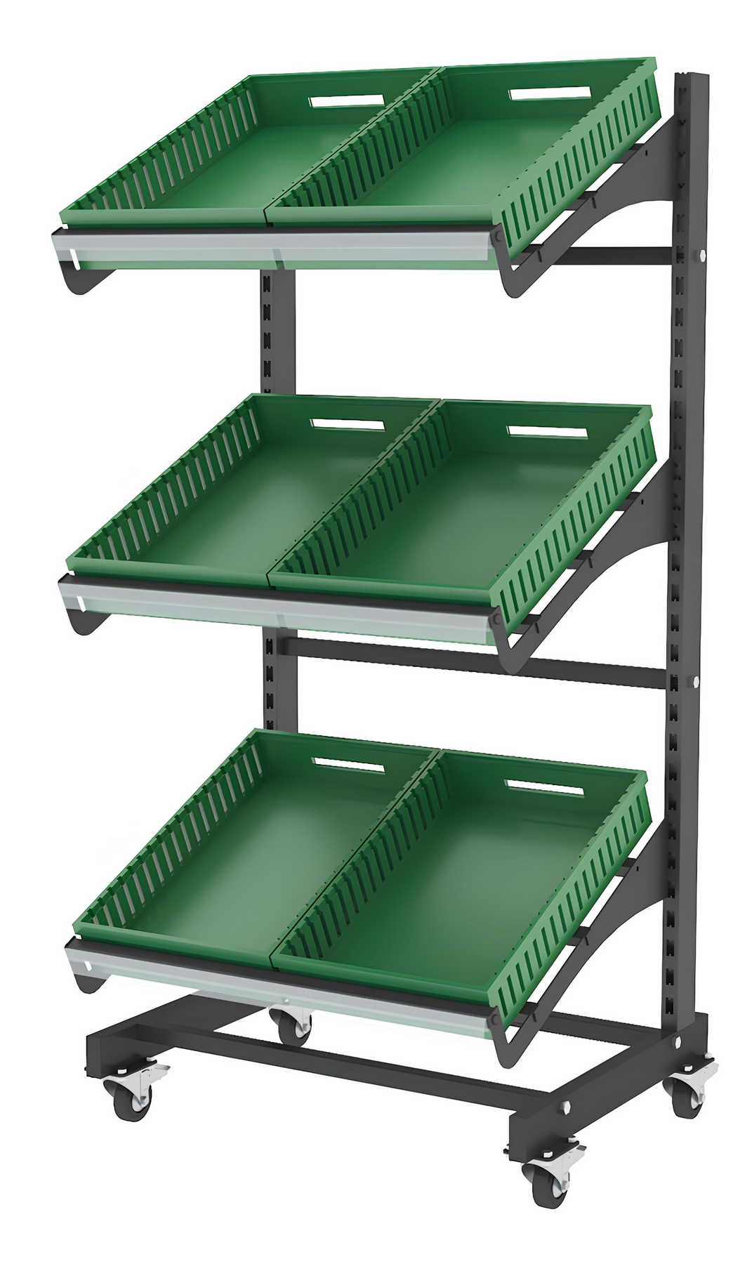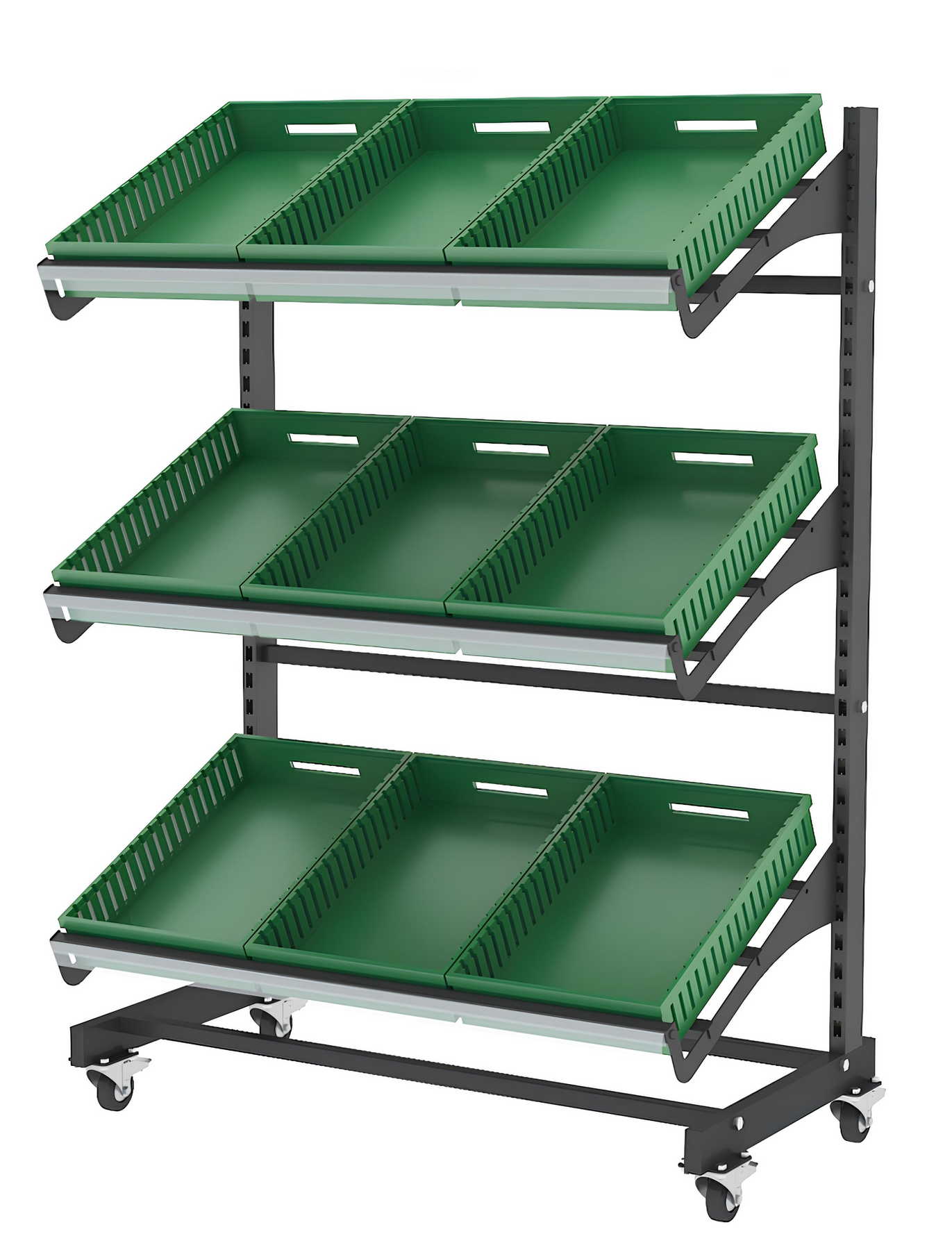 Το μονό τροχήλατο stand μαναβικής αποτελεί πρακτική και ευέλικτη λύση για την προβολή φρούτων και λαχανικών. Η τροχήλατη μεταλλική κατασκευή του επιτρέπει εύκολη μετακίνηση και αναδιάταξη, καθιστώντας το ιδανικό για καταστήματα με εσωτερικό ή εξωτερικό χώρο.