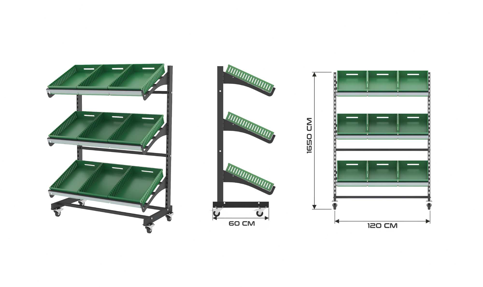 Το stand αποτελείται από μεταλλικό σκελετό βαρέως τύπου και τρία επίπεδα προβολής με ειδικά διαμορφωμένα πλαστικά καφάσια μαναβικής. Η κεκλιμένη διάταξη των ραφιών διευκολύνει την ορατότητα των προϊόντων και την εύκολη επιλογή από τον πελάτη, ενώ τα πλαϊνά τοιχώματα συγκρατούν με ασφάλεια τα προϊόντα κατά τη μετακίνηση.