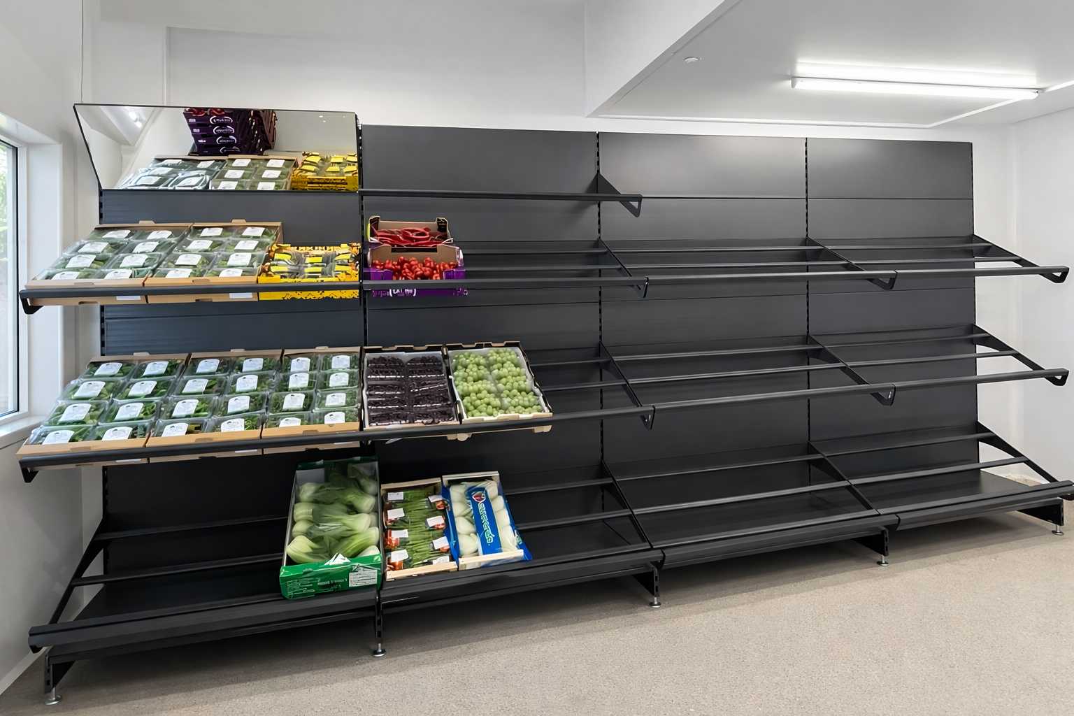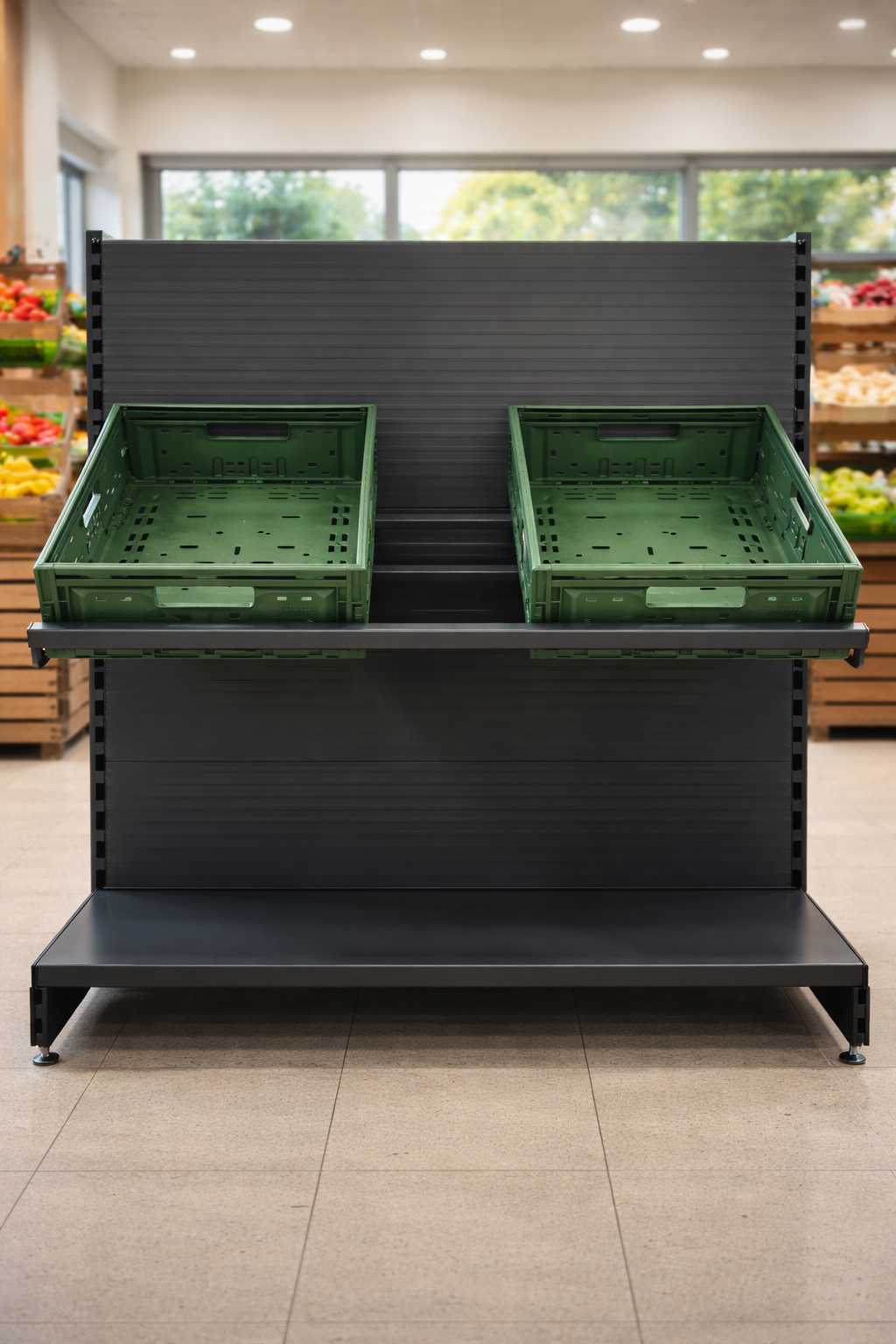 Το ράφι μαναβικής είναι ενισχυμένο σύστημα προβολής για φρούτα και λαχανικά, κατάλληλο για τοίχο ή γόνδολα. Υποστηρίζει πλαστικά ή ξύλινα τελάρα και προσφέρει ευελιξία στη διαμόρφωση του καταστήματος.