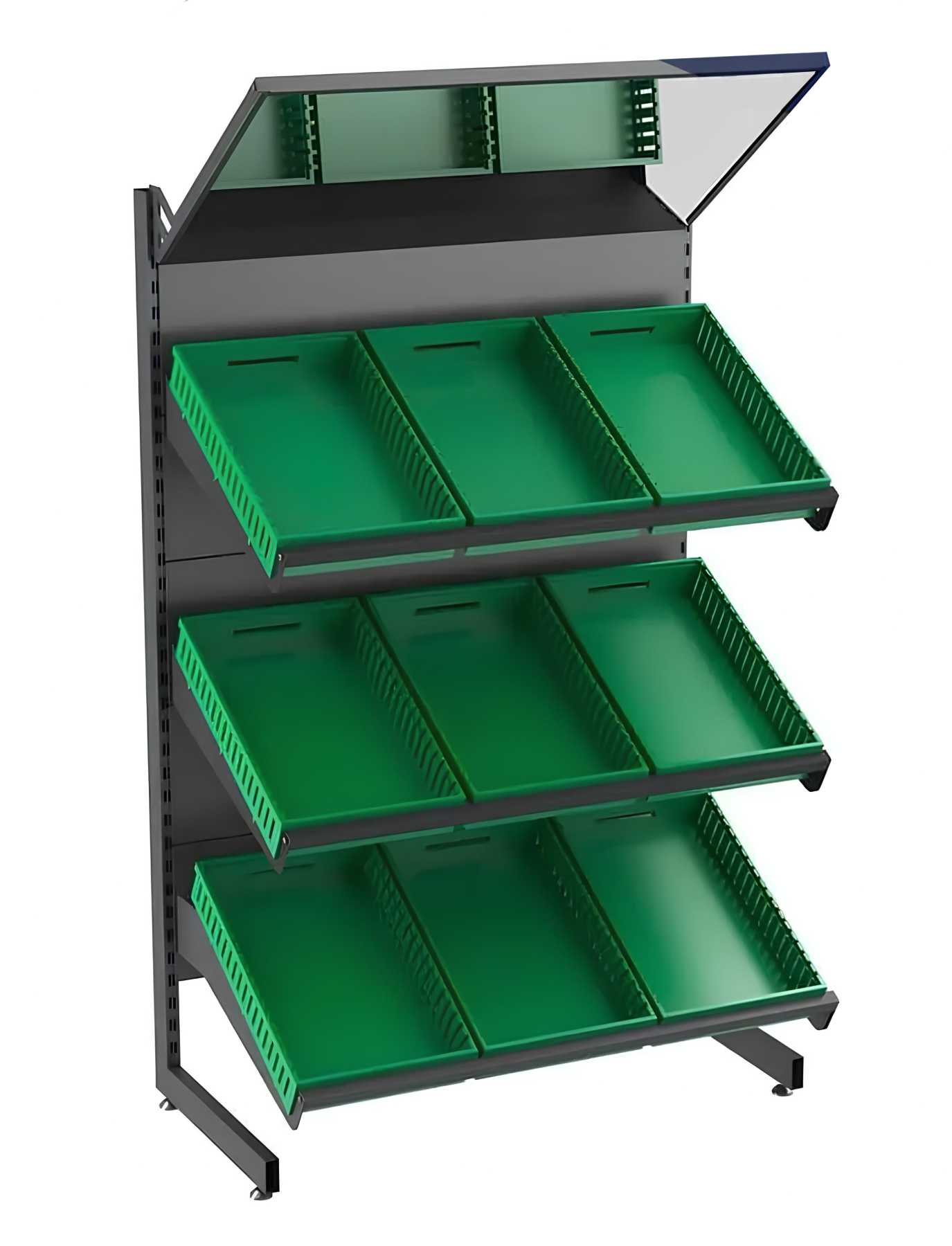 Η κλίση του ραφιού βελτιώνει την ορατότητα του προϊόντος προς τον πελάτη, ενώ ο προαιρετικός καθρέφτης στην κορυφή ενισχύει την αίσθηση πληρότητας και φωτεινότητας στον χώρο πώλησης.