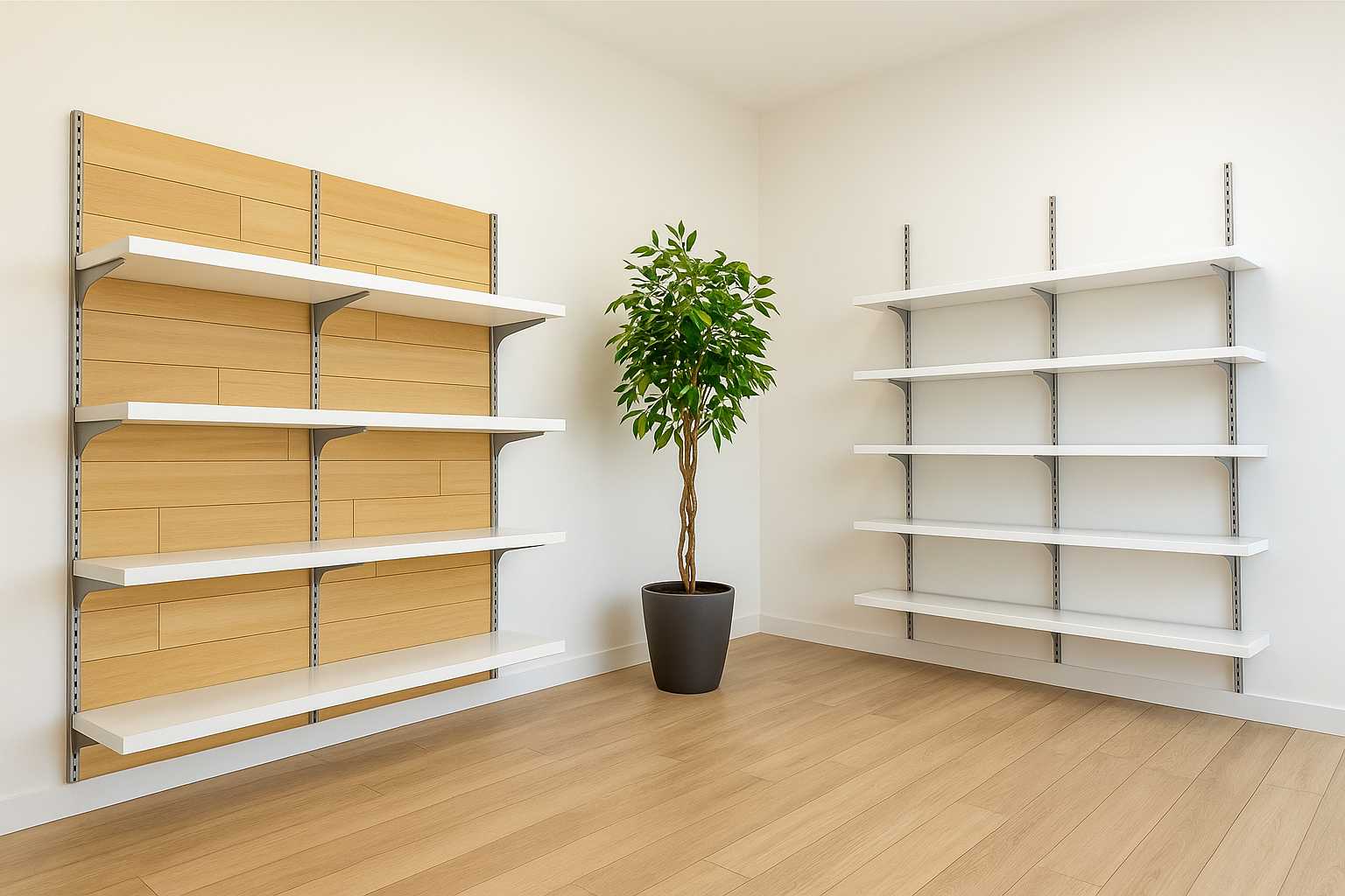 Το επιτοίχιο σύστημα με ράγα προσφέρει πρακτική, ευέλικτη και αισθητικά μοντέρνα λύση προβολής, συνδυάζοντας μεταλλικά ή μελαμινικά ράφια, πλάτες και μπάρες κρέμασης για κάθε τύπο επαγγελματικού χώρου.