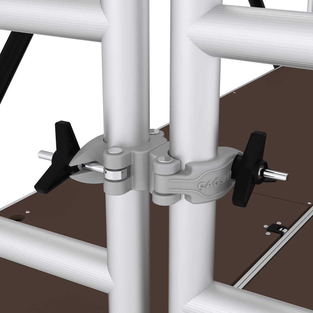 Περιστρεφόμενος σφιγκτήρας αλουμινίου για ασφαλή και ευέλικτη σύνδεση πλαισίων και σωλήνων σκαλωσιάς.