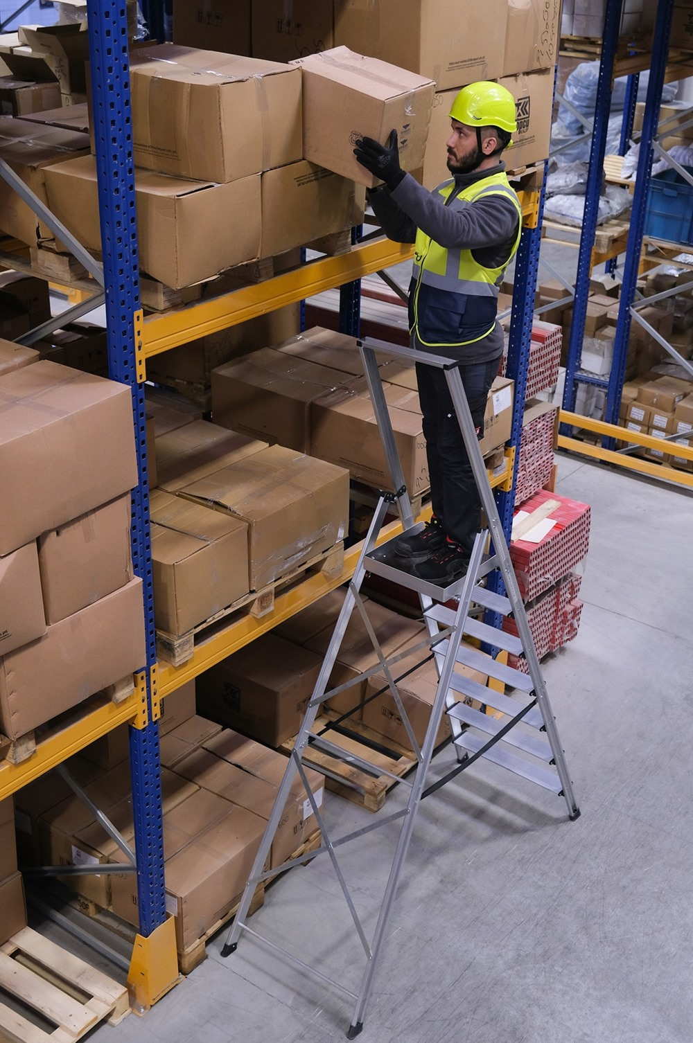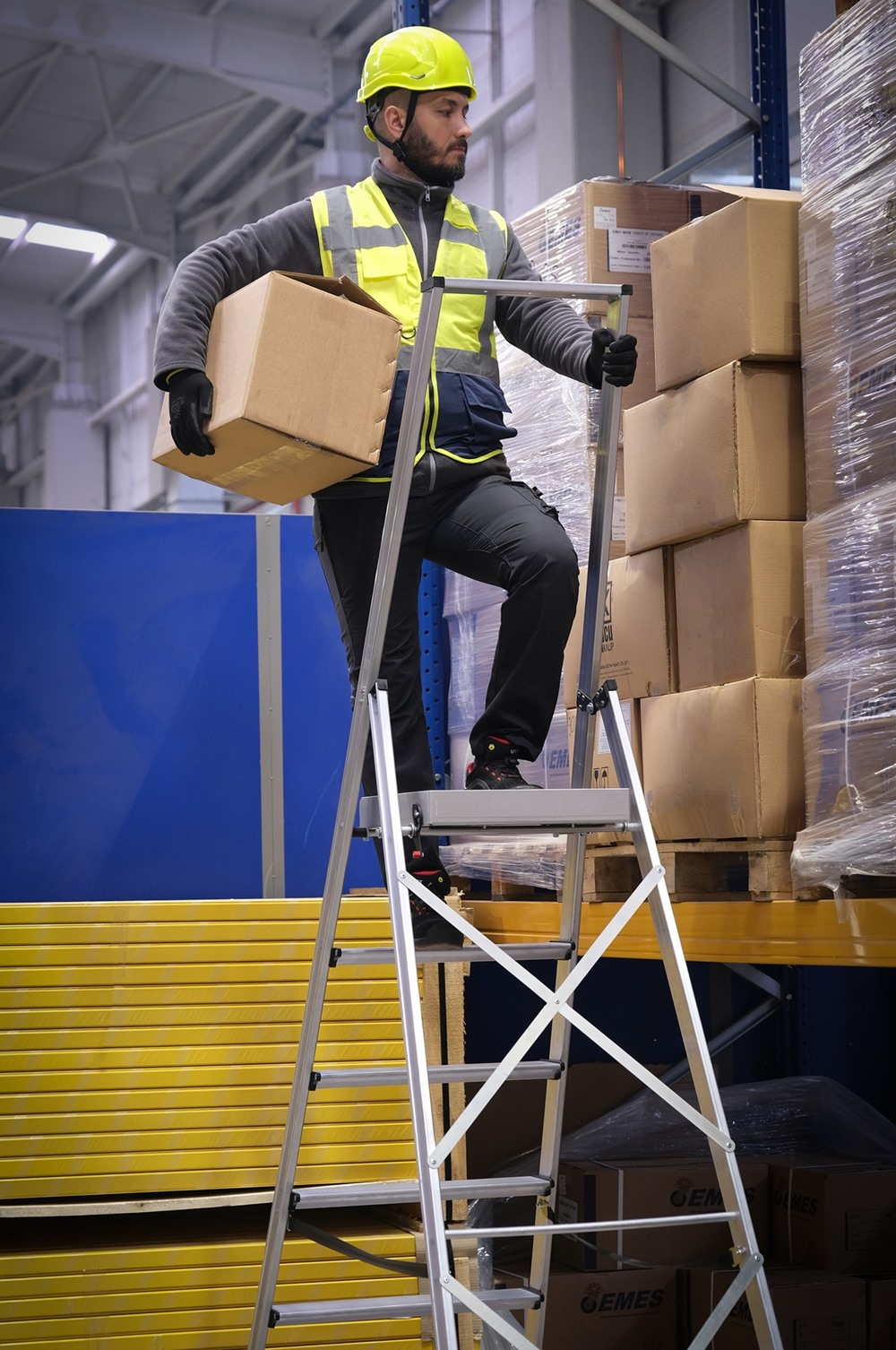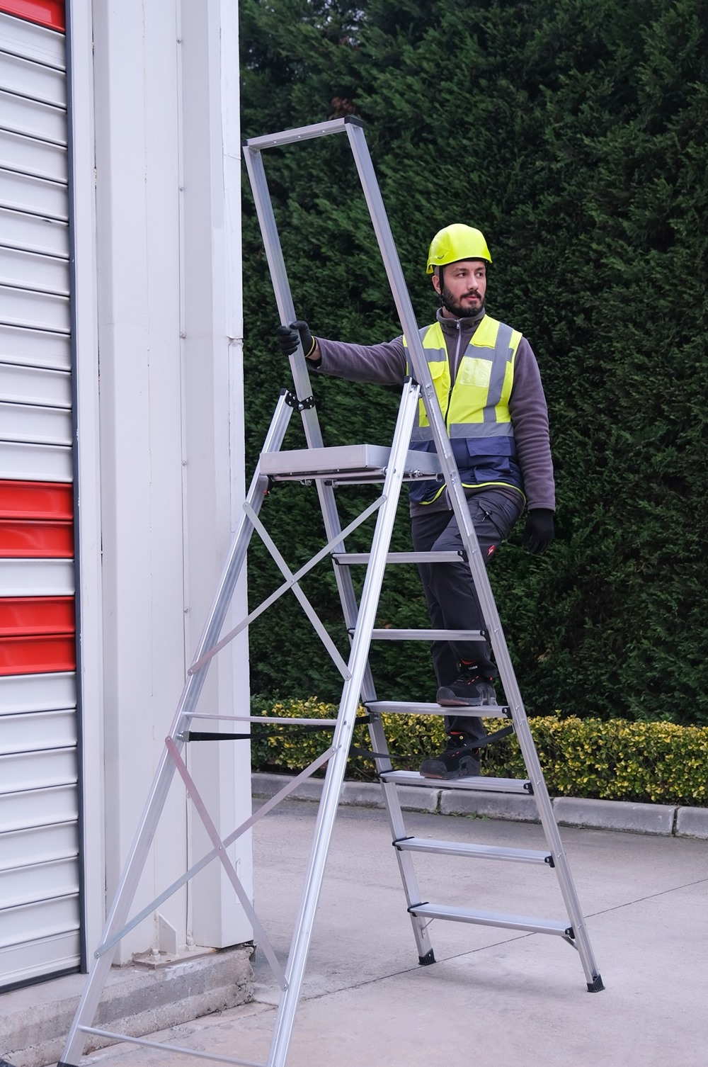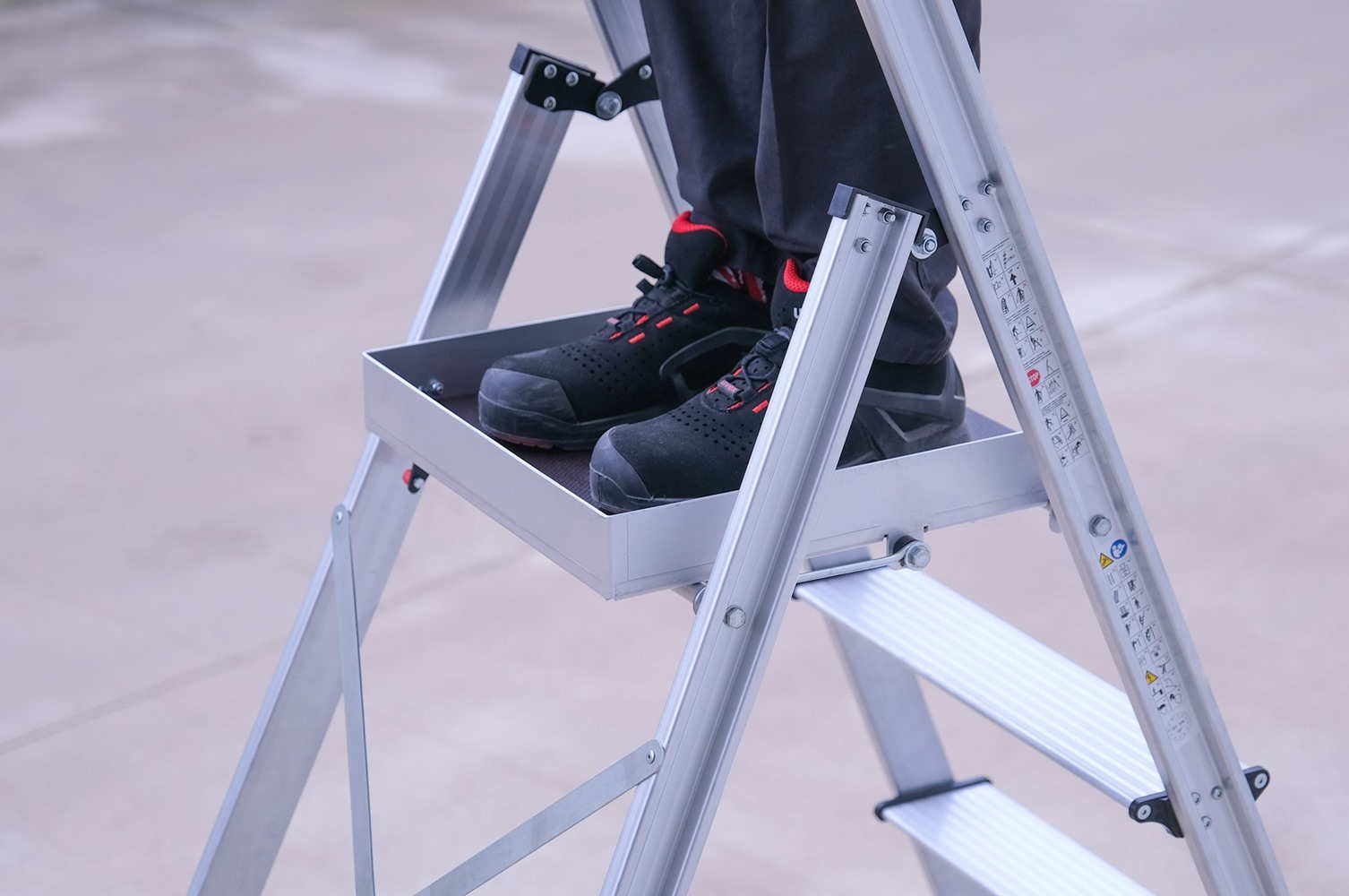 Η πλατφόρμα αυξημένου πλάτους επιτρέπει πιο ξεκούραστη στάση σώματος και καλύτερη ισορροπία, μειώνοντας την καταπόνηση σε πολύωρες εργασίες. Τα φαρδιά αντιολισθητικά σκαλοπάτια και τα ενισχυμένα πέλματα βάσης εξασφαλίζουν άριστη πρόσφυση και σταθερότητα σε διαφορετικούς τύπους δαπέδων.