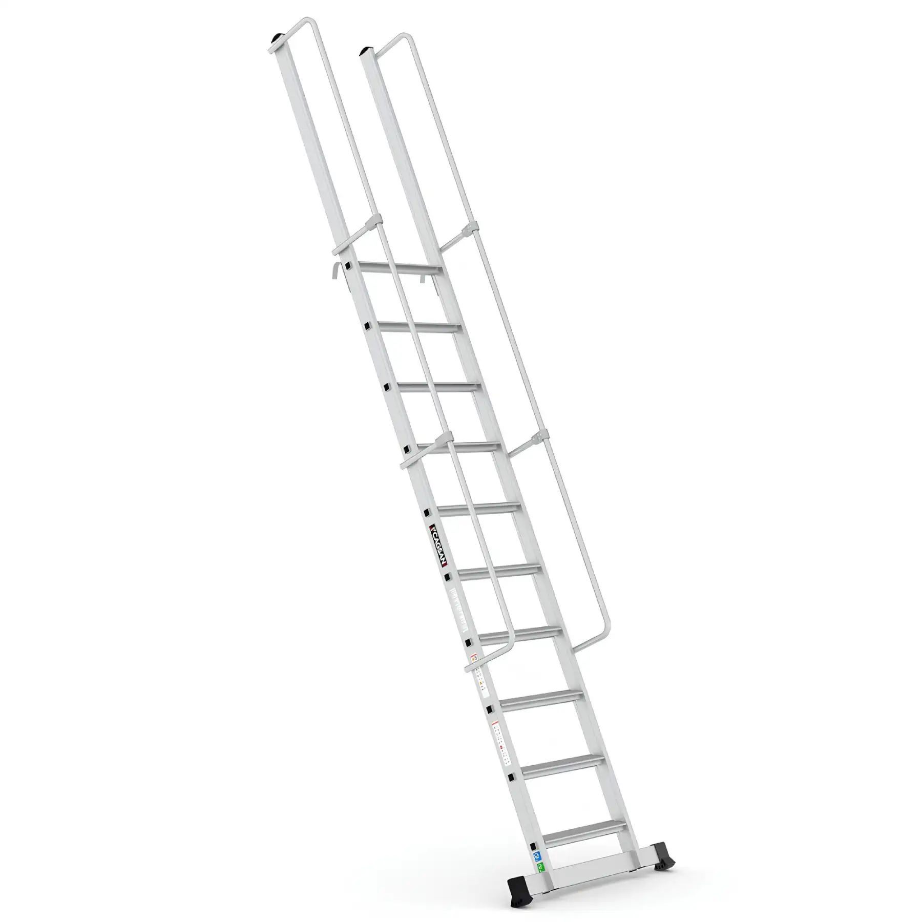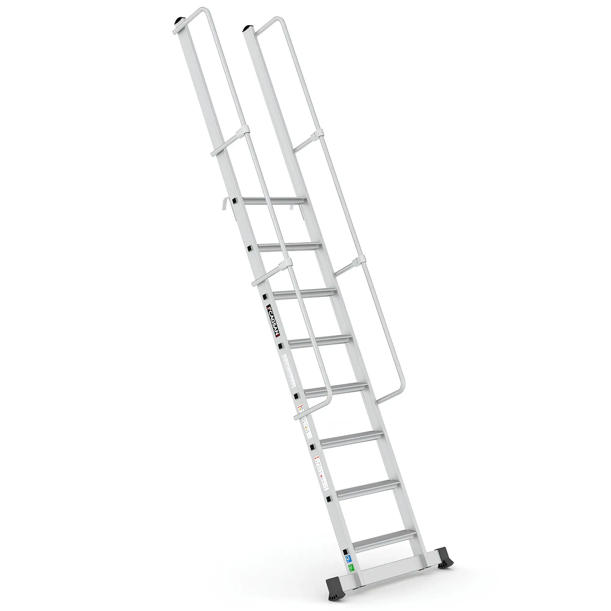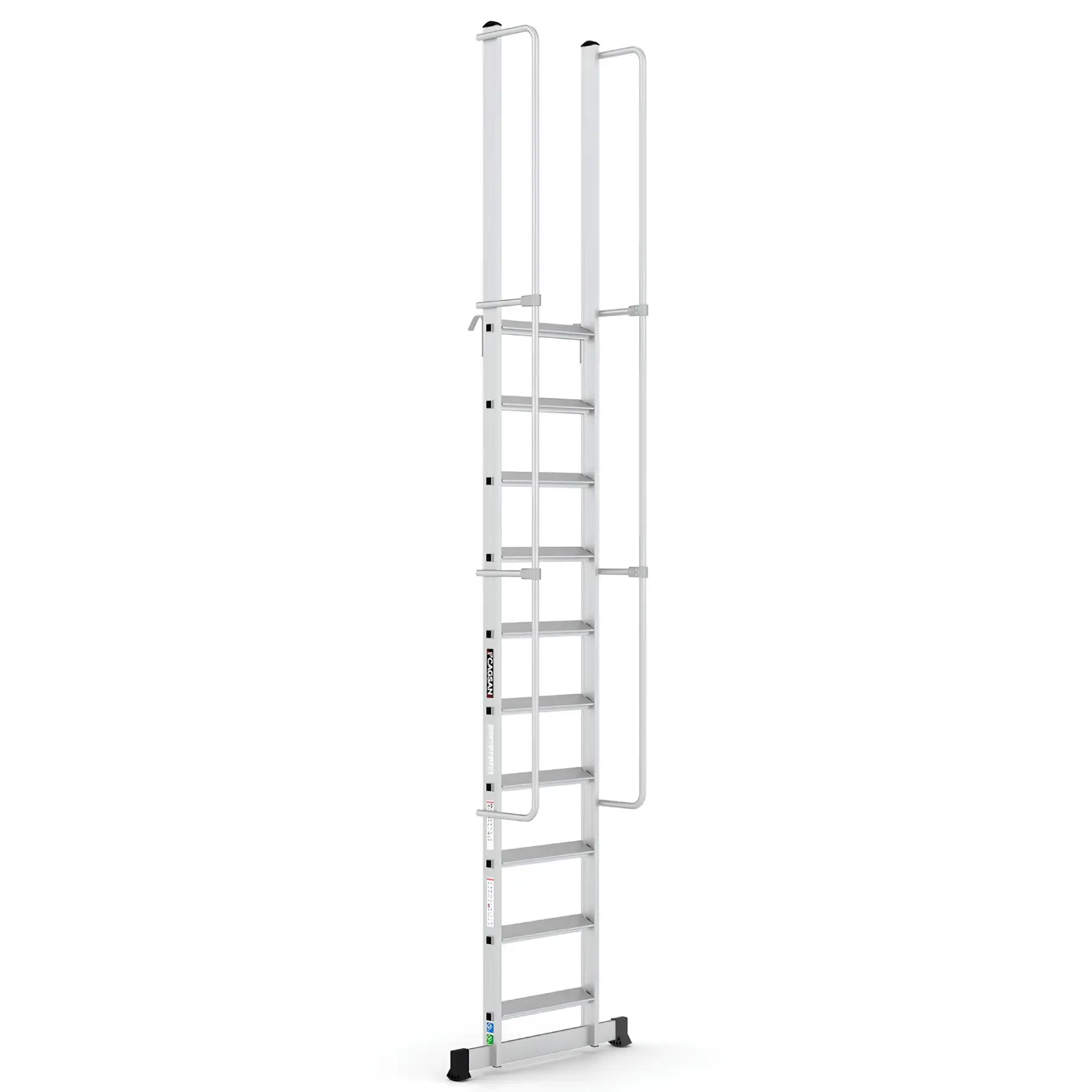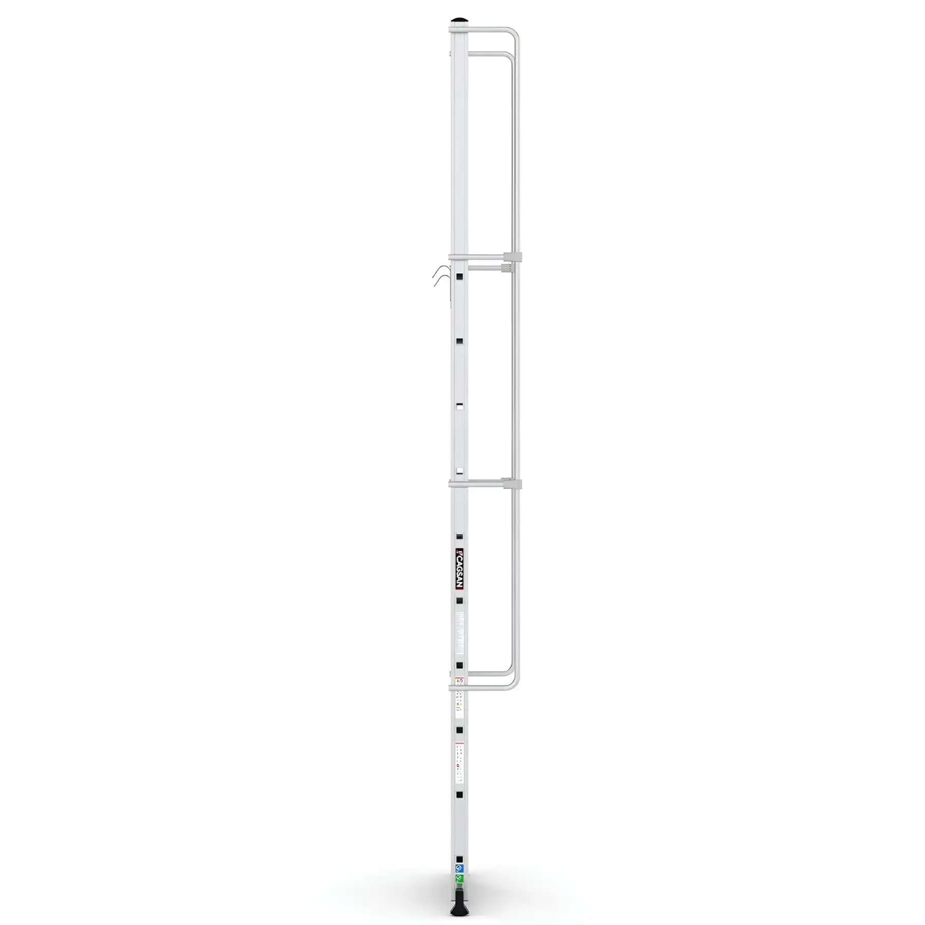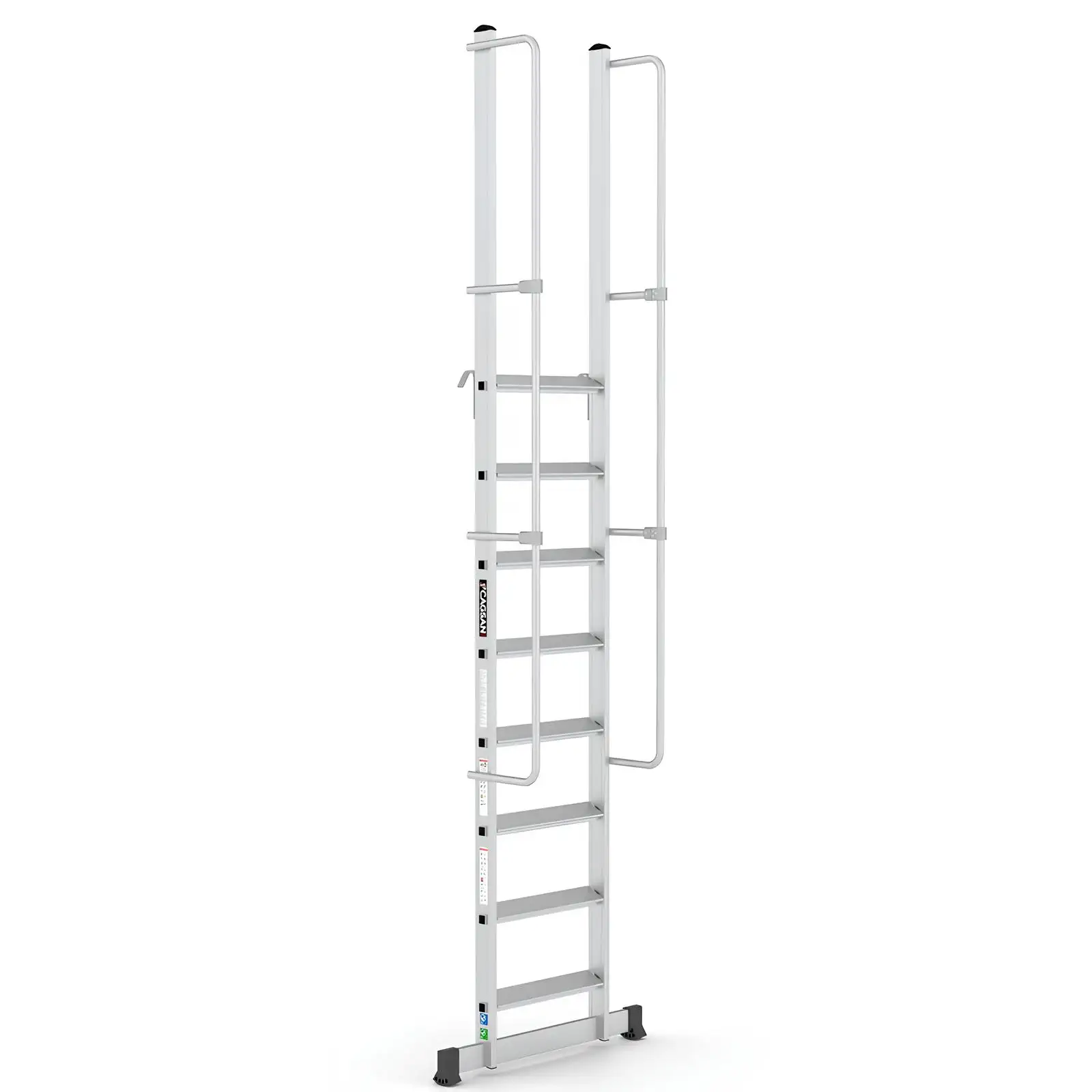 Το σύστημα στερέωσης με γάντζο επιτρέπει τη σταθερή τοποθέτηση της σκάλας επάνω σε δομές ή ράφια, εξασφαλίζοντας μέγιστη σταθερότητα κατά τη χρήση. Με αυτόν τον τρόπο αποτελεί ιδανική λύση για αποθήκες, βιομηχανικές εγκαταστάσεις, χώρους logistics, συνεργεία και τεχνικές εργασίες.